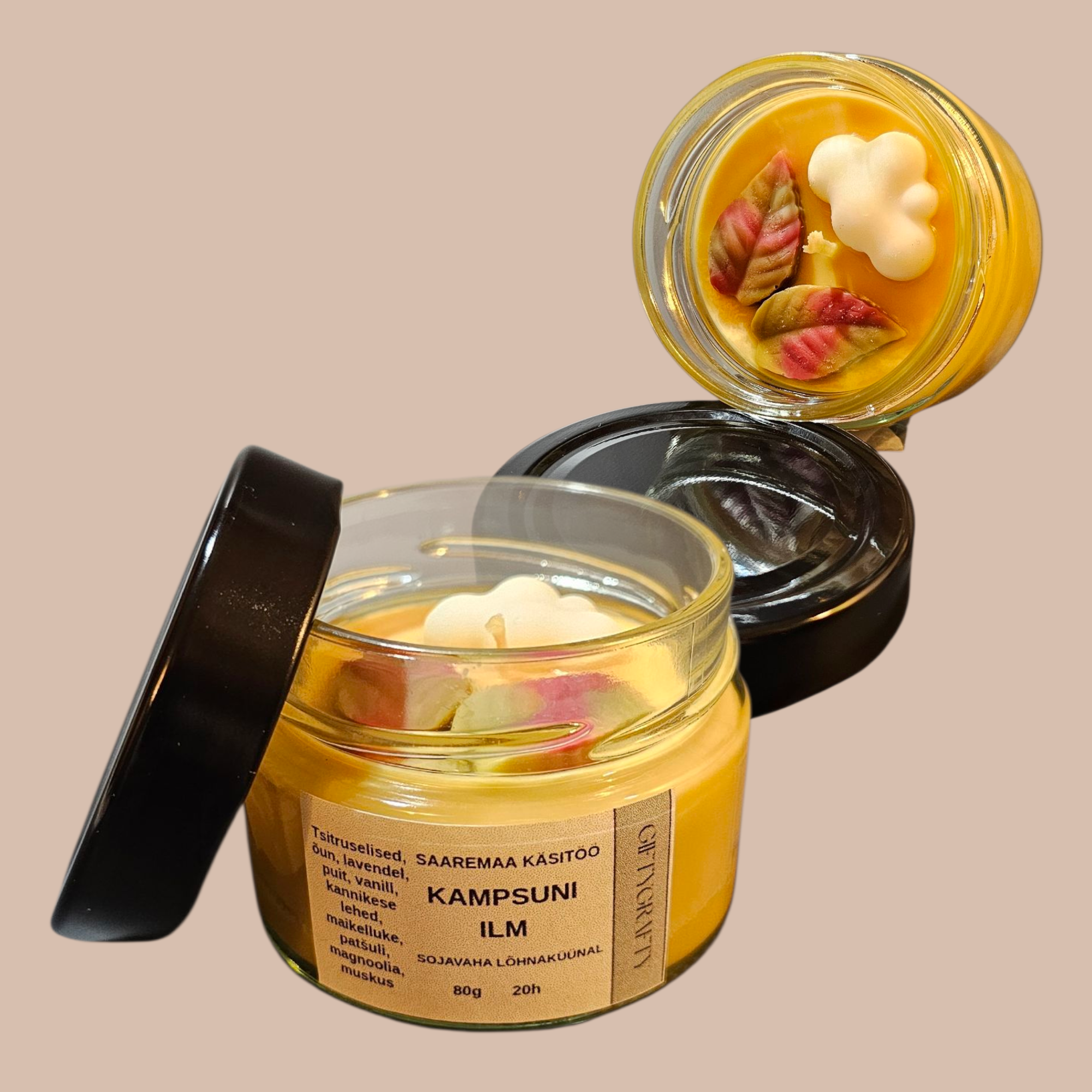 Kampsuni Ilm on loodud just pimedateks õhtuteks, mil hing ihkab soojust ja rahu. Selle küünla lõhn viib sind sügisese metsa vaikusesse, kus merevaigu pehmus kohtub värske õuna ja kašmiirise puidunoodiga.